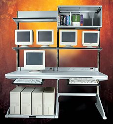 Computer Furniture Systems The solution for any computer racking or network furniture problem, Arlink Computer Furniture Systems feature an integrated system of interchangeable components that can be easily assembled to create a system to fit any room size, any layout requirement, and any hardware configuration. Six standard module sizes can be combined in any order to utilize all available space. Our steel columnar system and Arlink’s unique Definite Positioning System allows for efficient use of all vertical space from the floor to the top of the column structure. Arlink products are shipped 100% knocked down flat to simplify delivery and transportation within your building. Expanding or reconfiguring our systems as your needs change is literally, a snap! Most system components can be adjusted without the need for tools! Our open stabilizer panel design provides completed unobstructed access to the rear of equipment while providing exceptional lateral stability to the system. The Arlink system architecture is a future proof “backbone” that will never become obsolete. LAN furniture and Technical Workstations will always need to keep up with the changing hardware technology, and Arlink makes this practical and affordable. Vertical and horizontal cable management separates and organizes all cables and cords. Power beams, data beams, keyboard and monitor mounts, shelving, worksurfaces, and a variety of drawers and storage modules add further utility. Rack mount brackets allow you to attach hubs, patch panels, routers, etc. to the support columns wherever needed. Simple – Strong – Expandable – Adaptable. Arlink Computer Furniture Systems will improve the quality of life in your data processing center, or anyplace where racking or desk space includes a high concentration of IT hardware. |